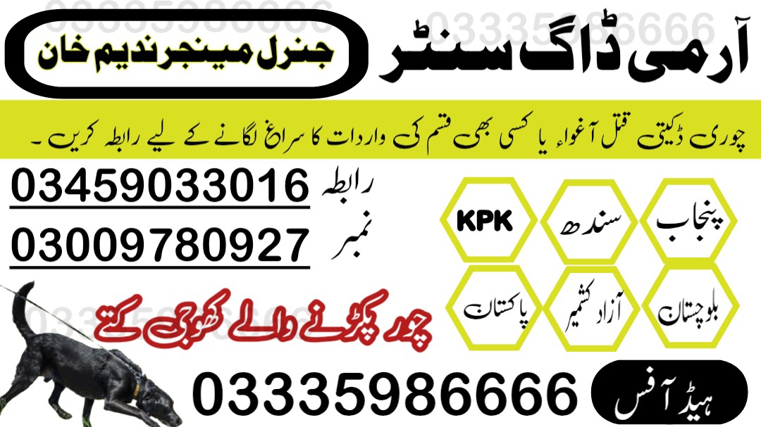 Army Dog Center Wah Cantt is always provide the professional highly trained Sniffers Dogs & Khoji Dogs In Wah Cantt. In case of any emergency like theft robbery kidnapping murder and other criminal activities. We serve in all Pakistan.