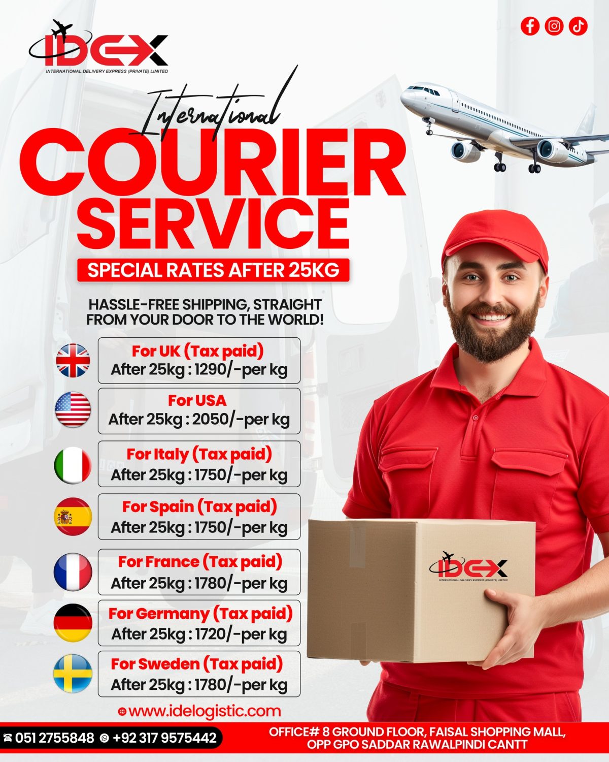 IDE Logistics International Courier (Head Office – Islamabad) provides reliable international and domestic courier services for documents, parcels, and commercial shipments. The branch offers door-to-door delivery, home pickup, secure packing, shipment tracking, and customs handling to ensure safe and timely delivery worldwide. Customers benefit from affordable rates, professional service, and dedicated support for personal and business shipping needs.